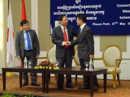 ※写真は、左から、Monyカンボジア公共事業省事務次官、Giangベトナム運輸省内陸水路管理局長、柴崎国際業務研究室長⇒当日の模様(you tube) ⇒講演録のページ