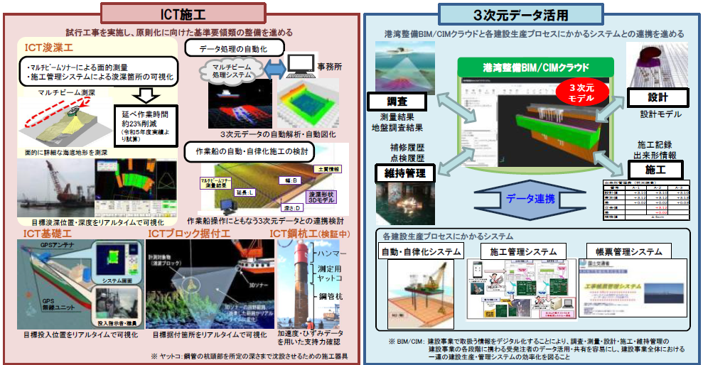| 港湾におけるi-Construction施策 出典:港湾におけるi-Construction・インフラDX推進委員会 令和6年度第2回委員会説明資料(国土交通省、令和7年2月) |