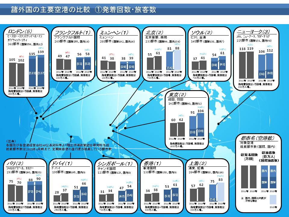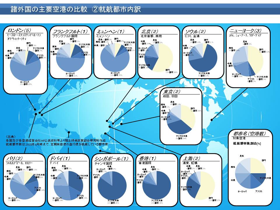 東京は、ソウル、香港、上海に比べてアジアへの就航都市数が少なく、アジア地域における競争力が弱いと言えます。また、北京、上海、ニューヨークと比較すると、国際線に対する国内線の割合が小さいと言えます。