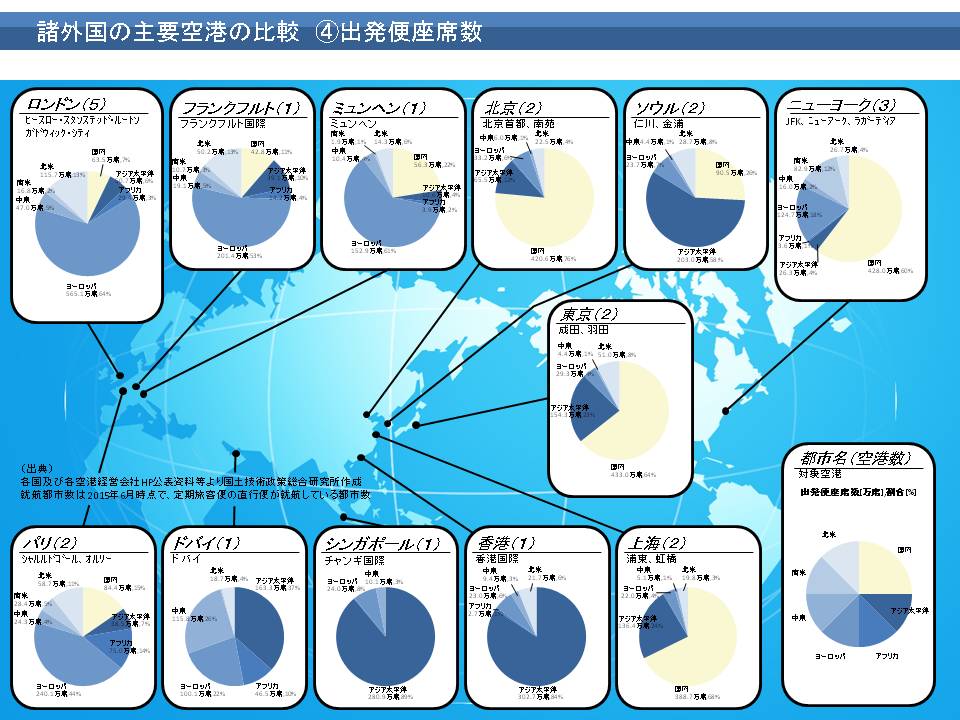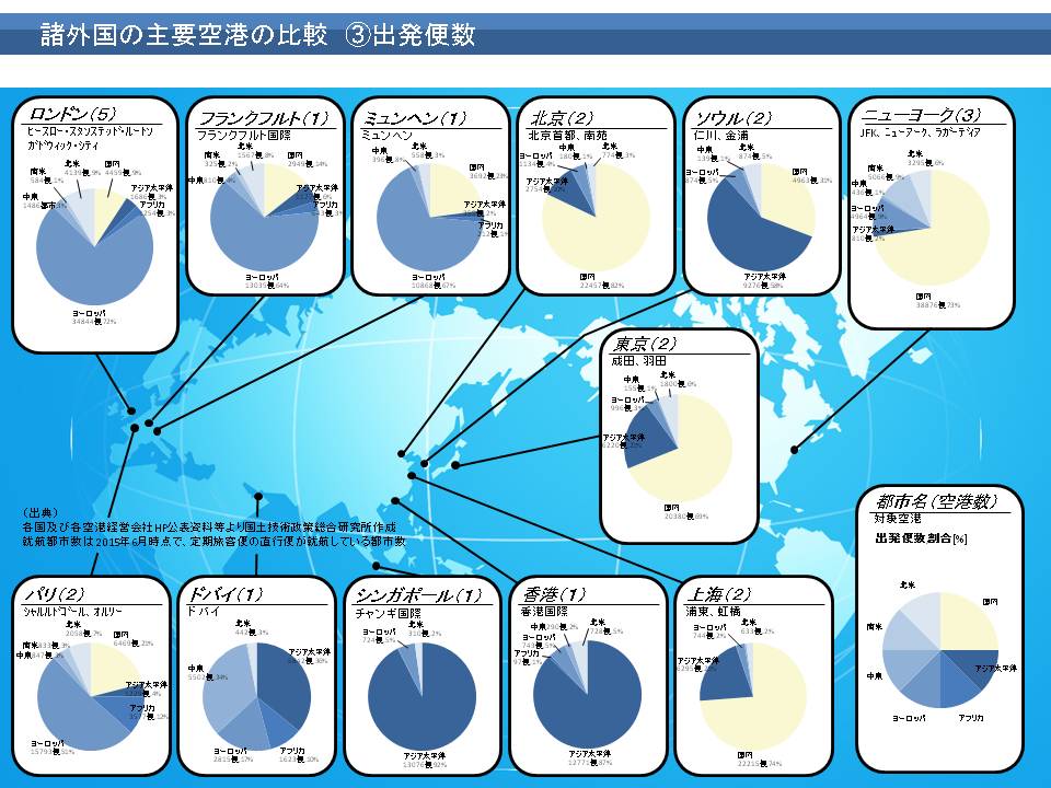 東京に関してはアジア路線の競争力は比較的弱いものの、北米路線では他のアジア諸国と比較して1.5〜2倍の輸送力を有し、アジア―北米間のハブ空港として強い競争力を持つと言えます。