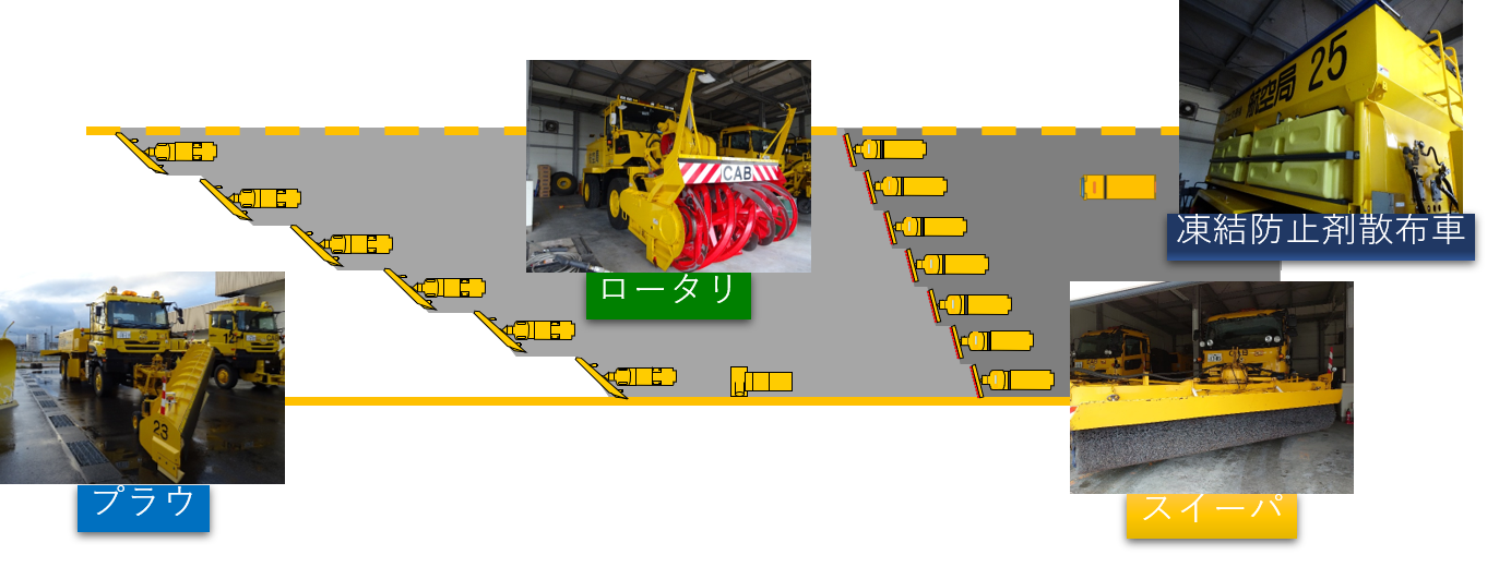 ・スイーパー除雪車:高速で回転するブラシと強力風速機(ブロア)によって路面上の雪を