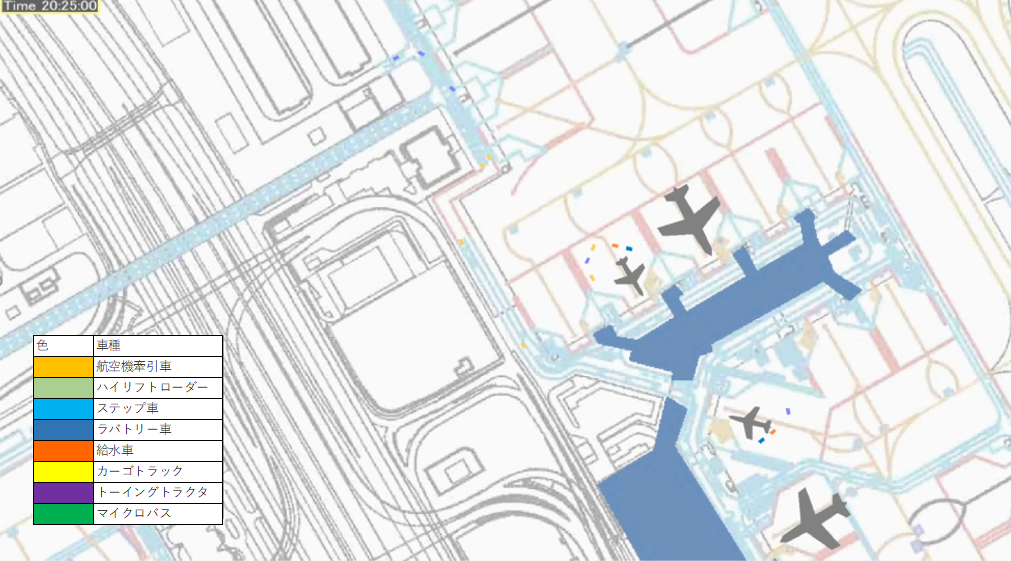 自動化技術導入時の空港内での車両の走行軌跡の分析や、空港全体での交通シミュレーションに関する研究を行っています。