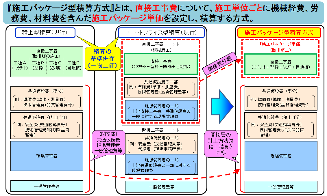 受発注者双方の労力軽減等を目的とした「ユニットプライス型積算方式」を平成16年度より一部の工事で試行してきましたが、より一層の積算の効率化を図るため「ユニットプライス型積算方式」の課題を改良した「施工パッケージ型積算方式」の空港土木工事への導入に向けた検討を行っています。